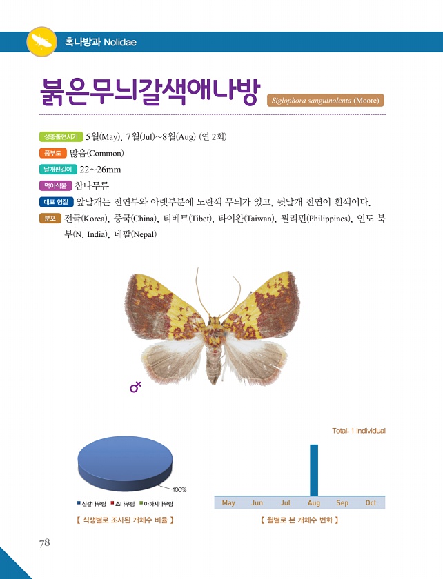 78 혹나방과 Nolidae 성충출현시기 5월 May , 7월 Jul 8월 Aug 연 2회 풍부도 많음 Common 날개편길이 2226mm 먹이식물 참나무류 대표 형질 앞날개는 전연부와 아랫부분에 노란색 무늬가 있고, 뒷날개 전연이 흰색이다. 분포 전국 Korea , 중국 China , 티베트 Tibet , 타이완 Taiwan , 필리핀 Philippines , 인도 북 부 N. India , 네팔 Nepal 붉은무늬갈색애나방 Siglophora sanguinolenta Moore 【 식생별로 조사된 개체수 비율 】 100% 신갈나무림 소나무림 아까시나무림 【 월별로 본 개체수 변화 】 Total1 individual May Jun Jul Aug SepOct