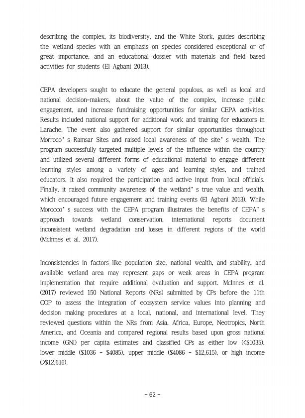 62 describing the complex, its biodiversity, and the White Stork, guides describing the wetland species with an emphasis on species considered exceptional or of great importance, and an educational dossier with materials and field based activities for students El Agbani 2013 CEPA developers sought to educate the general populous, as well as local and national decision-makers, about the value of th...