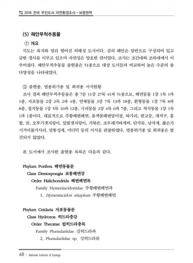2016 전국 무인도서 자연환경조사 보령권역 68 ? National Institute of Ecology 5 해안무척추동물 ① 개요 석도는 육지와 멀리 떨어진 외해성 도서이다. 섬의 해안은 암반으로 구성되어 있고 급한 경사를 이루고 있으며 자연성은 양호한 편이었다. 조사는 조간대와 조하대에서 이 루어졌다. 해안무척추동물 출현종은 51종으로 대상 도서들과 비교하여 높은 수준의 종 다양성을 나타내었다. ② 출현종, 멸종위기종 및 희귀종 서식현황 조사 결과 해안무척추동물은 총 7문 11강 27목 41과 51종으로, 해면동물 1강 1목 1과 1종, 자포동물 2강 2목 2과 4종, 연체동물 3강 7목 13과 18종, 환형동물 1강 7목 8과 8종, 절지동물 1강 5목 10과 12종, 극피동물 2강 4목 6과 7종,...
