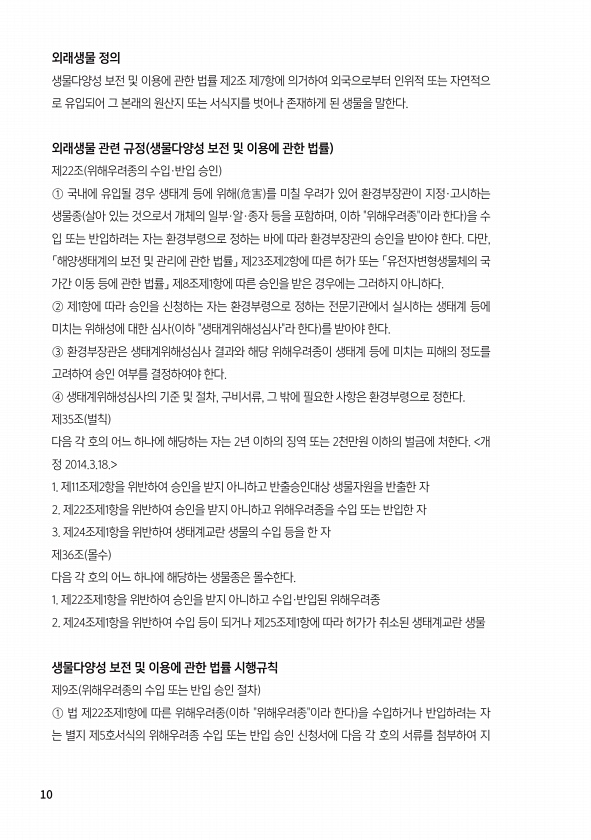 10 외래생물 정의 생물다양성 보전 및 이용에 관한 법률 제2조 제7항에 의거하여 외국으로부터 인위적 또는 자연적으 로 유입되어 그 본래의 원산지 또는 서식지를 벗어나 존재하게 된 생물을 말한다. 외래생물 관련 규정 생물다양성 보전 및 이용에 관한 법률 제22조 위해우려종의 수입·반입 승인 ① 국내에 유입될 경우 생태계 등에 위해 危害 를 미칠 우려가 있어 환경부장관이 지정·고시하는 생물종 살아 있는 것으로서 개체의 일부·알·종자 등을 포함하며, 이하 위해우려종이라 한다 을 수 입 또는 반입하려는 자는 환경부령으로 정하는 바에 따라 환경부장관의 승인을 받아야 한다. 다만, 「해양생태계의 보전 및 관리에 관한 법률」 제23조제2항에 따른 허가 또는 「유전자변형생물체의 국 가간 이동 등에 관한 법률」 제8조제1...