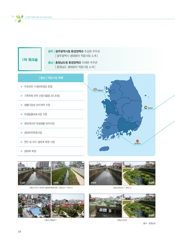[ 충남] 아산시 온천천 생태하천복원사업 왕조2교 귀선1교 [ 충남 ] 왕조2교 왕조1교 [ 충남] 생태습지 1 [ 충남 ] 온천천 조성전 조성전 조성후 조성후 조성후 조성후 [ 충남 ] 적응사업 목록 ? 주요하천 수생태측정망 운영 ? 기후변화 취약 산림식물종 모니터링 ? 생물다양성 관리계약 지원 ? 야생동물보호사업 지원 ? 생태계교란 야생생물 퇴치사업 ? 생태하천복원사업 ? 연안 및 하구 생태계 복원 사업 ? 생태축 복원 출처 충청남도 광주광역시 충청남도 경상남도 광주┃광주광역시청 환경정책과 주성원 주무관 [ 광주광역시 생태분야 적응사업 소개 ] 충남┃충청남도청 환경정책과 이재현 주무관 [ 충청남도 생태분야 적응사업 소개 ] 1차 워크숍 2. 광역 지자체 적응 지식 공유 워크숍 조성전 조성전10