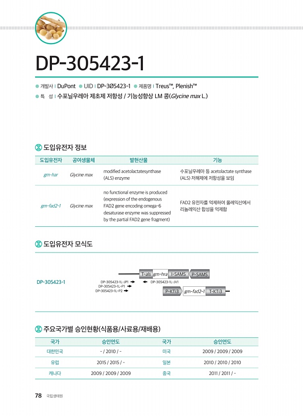78 국립생태원 ● 개발사ⅠDuPont ● UIDⅠDP-3Ø5423-1 ● 제품명ⅠTreus™, Plenish™ ● 특 성Ⅰ수포닐우레아 제초제 저항성 기능성향상 LM 콩 Glycine max L. DP-305423-1 주요국가별 승인현황 식품용/사료용/재배용 국가 승인연도 국가 승인연도 대한민국 2010 미국 2009 2009 2009 유럽 2015 2015 일본 2010 2010 2010 캐나다 2009 2009 2009 중국 2011 2011 도입유전자 정보 도입유전자 공여생물체 발현산물 기능 gm-har Glycine max modified acetolactatesynthase ALS enzyme 수포닐우레아 등 acetolactate synthase ALS 저해제에 저항성을 보임 gm-fad2-1 G...