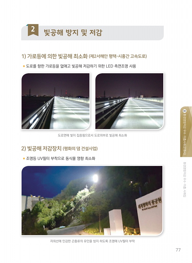 환경영향저감 우수·미흡 사례집 환경영향저감 우수·미흡사례 운영시 Ⅲ 77 2 빛공해 방지 및 저감 1 가로등에 의한 빛공해 최소화 제2서해안 평택-시흥간 고속도로 2 빛공해 저감장치 평화의 댐 건설사업 도로면에 빛이 집중됨으로서 도로외부로 빛공해 최소화 자외선에 민감한 곤충류의 유인을 방지 하도록 조명에 UV필터 부착 ● 도로를 향한 가로등을 없애고 빛공해 저감하기 위한 LED 측면조명 사용 ● 조명등 UV필터 부착으로 동식물 영향최소화