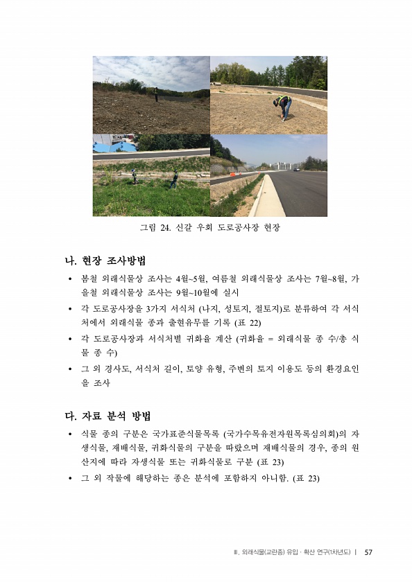 그림 신갈 우회 도로공사장 현장 나 현장 조사방법 ? 봄철 외래식물상 조사는 4월5월, 여름철 외래식물상 조사는 7월8월, 가 을철 외래식물상 조사는 9월10월에 실시 ? 각 도로공사장을 3가지 서식처 나지, 성토지, 절토지 로 분류하여 각 서식 처에서 외래식물 종과 출현유무를 기록 표 22 ? 각 도로공사장과 서식처별 귀화율 계산 귀화율 = 외래식물 종 수/총 식 물 종 수 ? 그 외 경사도, 서식처 길이, 토양 유형, 주변의 토지 이용도 등의 환경요인 을 조사 다 자료 분석 방법 ? 식물 종의 구분은 국가표준식물목록 국가수목유전자원목록심의회 의 자 생식물, 재배식물, 귀화식물의 구분을 따랐으며 재배식물의 경우, 종의 원 산지에 따라 자생식물 또는 귀화식물로 구분 표 23 ? 그 외 작물에 해당하는 종은 ...
