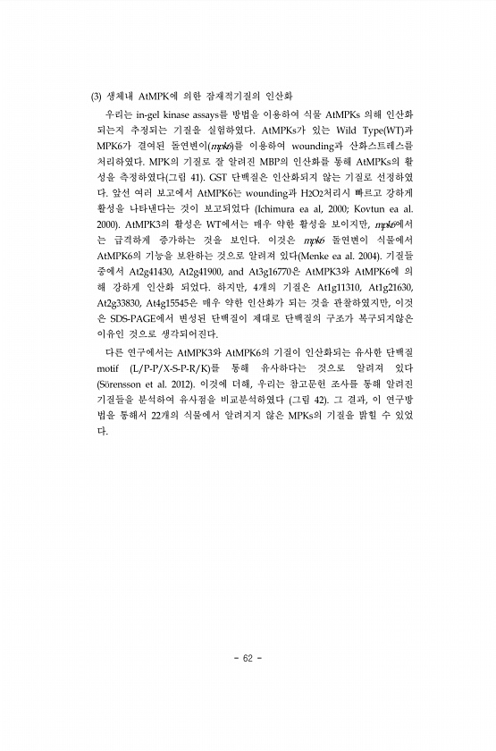 62 3 생체내 AtMPK에 의한 잠재적기질의 인산화 우리는 in-gel kinase assays를 방법을 이용하여 식물 AtMPKs 의해 인산화 되는지 추정되는 기질을 실험하였다. AtMPKs가 있는 Wild Type WT 과 MPK6가 결여된 돌연변이 mpk6 를 이용하여 wounding과 산화스트레스를 처리하였다. MPK의 기질로 잘 알려진 MBP의 인산화를 통해 AtMPKs의 활 성을 측정하였다 그림 41 GST 단백질은 인산화되지 않는 기질로 선정하였 다. 앞선 여러 보고에서 AtMPK6는 wounding과 H2O2처리시 빠르고 강하게 활성을 나타낸다는 것이 보고되었다 Ichimura ea al, 2000; Kovtun ea al. 2000 AtMPK3의 활성은 WT에서는 매우 약한 활성을 보이지만...