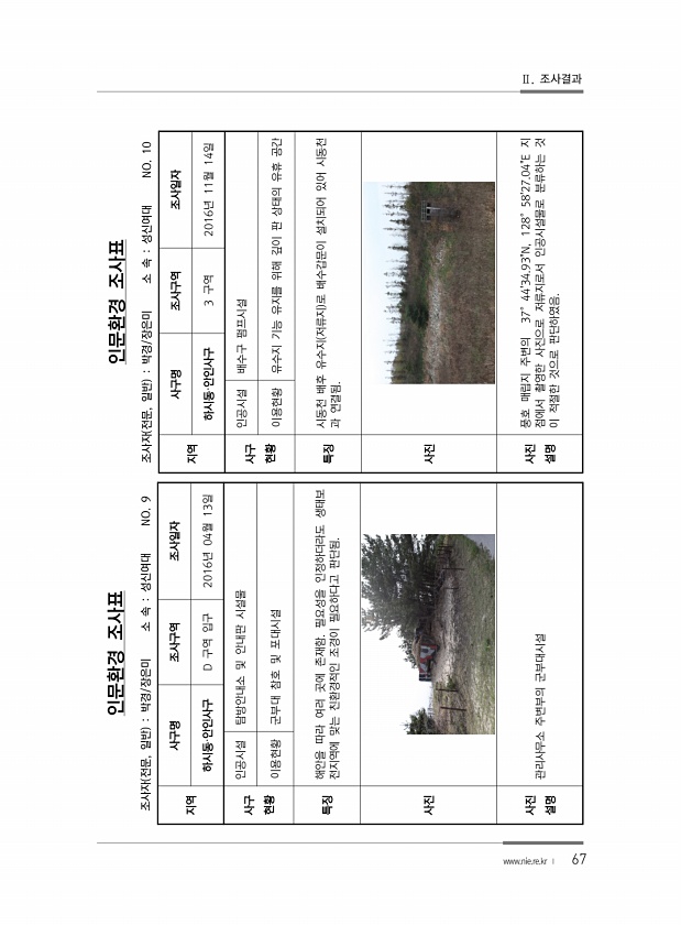 67 인문환경 조사표 조사자 전문, 일반 박경/장은미 소 속 성신여대 NO. 9 지역 사구명 조사구역 조사일자 하시동·안인사구 D 구역 입구 2016년 04월 13일 사구 현황 인공시설 탐방안내소 및 안내판 시설물 이용현황 군부대 참호 및 포대시설 특징 해안을 따라 여러 곳에 존재함. 필요성을 인정하더라도 생태보 전지역에 맞는 친환경적인 조경이 필요하다고 판단됨. 사진 사진 설명 관리사무소 주변부의 군부대시설 인문환경 조사표 조사자 전문, 일반 박경/장은미 소 속 성신여대 NO. 10 지역 사구명 조사구역 조사일자 하시동·안인사구 3 구역 2016년 11월 14일 사구 현황 인공시설 배수구 펌프시설 이용현황 유수지 기능 유지를 위해 깊이 판 상태의 유휴 공간 특징 시동천 배후 유수지 저류지 로 배수갑문이 설...