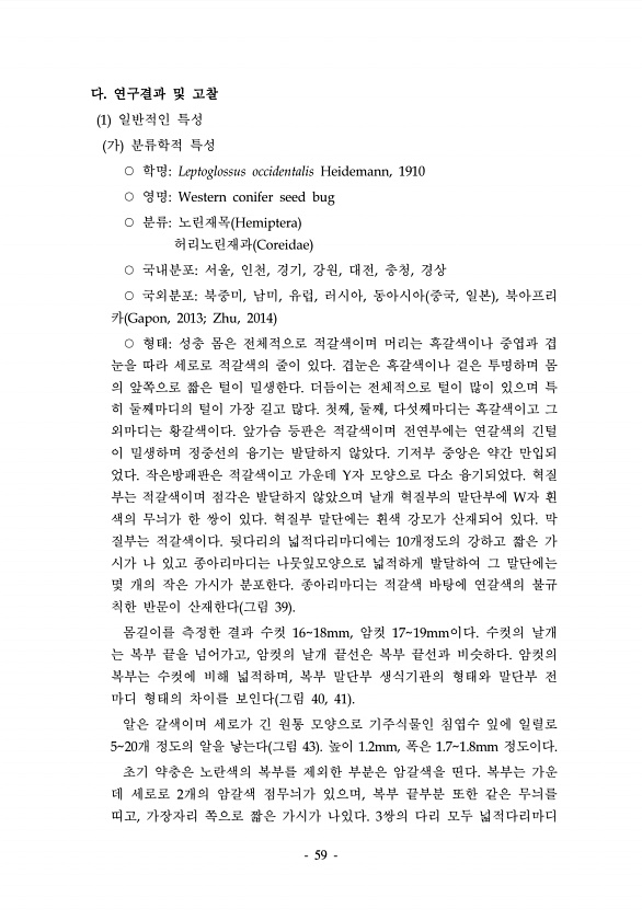 59 다. 연구결과 및 고찰 1 일반적인 특성 가 분류학적 특성 ○ 학명Leptoglossus occidentalis Heidemann, 1910 ○ 영명Western conifer seed bug ○ 분류노린재목 Hemiptera 허리노린재과 Coreidae ○ 국내분포서울, 인천, 경기, 강원, 대전, 충청, 경상 ○ 국외분포북중미, 남미, 유럽, 러시아, 동아시아 중국, 일본 , 북아프리 카 Gapon, 2013; Zhu, 2014 ○ 형태성충 몸은 전체적으로 적갈색이며 머리는 흑갈색이나 중엽과 겹 눈을 따라 세로로 적갈색의 줄이 있다. 겹눈은 흑갈색이나 겉은 투명하며 몸 의 앞쪽으로 짧은 털이 밀생한다. 더듬이는 전체적으로 털이 많이 있으며 특 히 둘째마디의 털이 가장 길고 많다. 첫째, 둘째, 다섯...