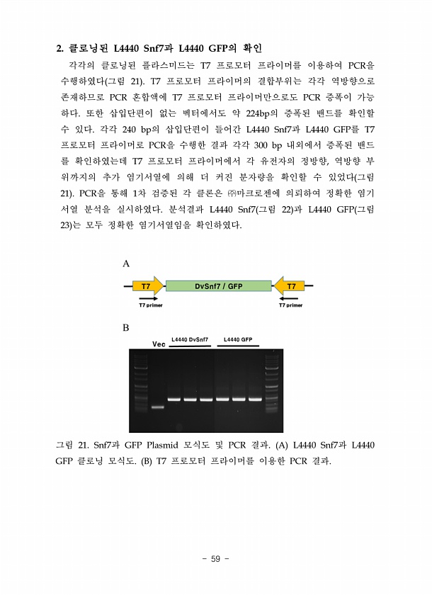 2. 클로닝된 L4440 Snf7과 L4440 GFP의 확인 각각의 클로닝된 플라스미드는 T7 프로모터 프라이머를 이용하여 PCR을 수행하였다 그림 21 T7 프로모터 프라이머의 결합부위는 각각 역방향으로 존재하므로 PCR 혼합액에 T7 프로모터 프라이머만으로도 PCR 증폭이 가능 하다. 또한 삽입단편이 없는 벡터에서도 약 224bp의 증폭된 밴드를 확인할 수 있다. 각각 240 bp의 삽입단편이 들어간 L4440 Snf7과 L4440 GFP를 T7 프로모터 프라이머로 PCR을 수행한 결과 각각 300 bp 내외에서 증폭된 밴드 를 확인하였는데 T7 프로모터 프라이머에서 각 유전자의 정방향, 역방향 부 위까지의 추가 염기서열에 의해 더 커진 분자량을 확인할 수 있었다 그림 21 PCR을 통해 1차 검증된 각...