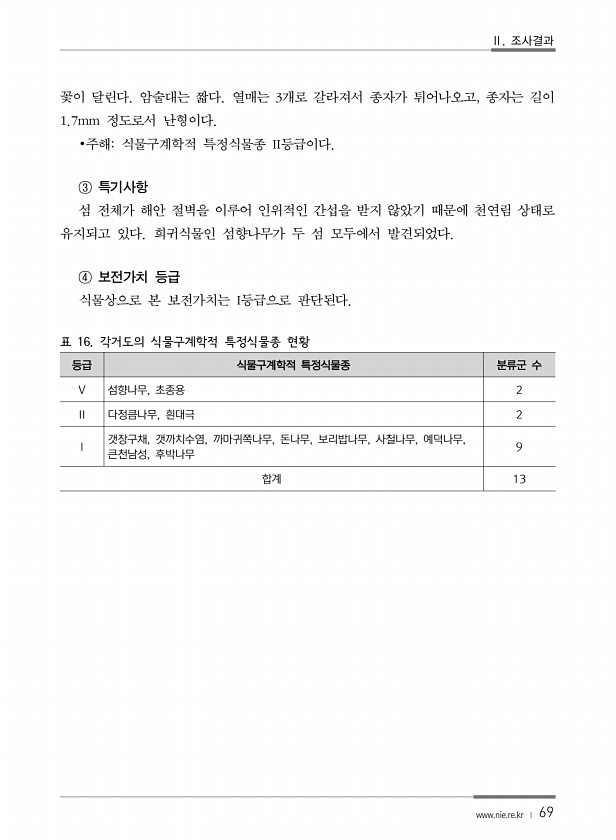 Ⅱ. 조사결과 www.nie.re.kr ? 69 꽃이 달린다. 암술대는 짧다. 열매는 3개로 갈라져서 종자가 튀어나오고, 종자는 길이 1.7mm 정도로서 난형이다. ?주해식물구계학적 특정식물종 II등급이다. ③ 특기사항 섬 전체가 해안 절벽을 이루어 인위적인 간섭을 받지 않았기 때문에 천연림 상태로 유지되고 있다. 희귀식물인 섬향나무가 두 섬 모두에서 발견되었다. ④ 보전가치 등급 식물상으로 본 보전가치는 I등급으로 판단된다. 표 16. 각거도의 식물구계학적 특정식물종 현황 등급 식물구계학적 특정식물종 분류군 수 V 섬향나무, 초종용 2 II 다정큼나무, 흰대극 2 Ⅰ 갯장구채, 갯까치수염, 까마귀쪽나무, 돈나무, 보리밥나무, 사철나무, 예덕나무, 큰천남성, 후박나무 9 합계13