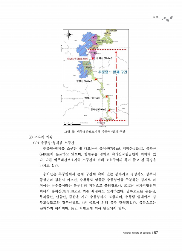 식 생 National Institute of EcologyⅠ67 그림 29. 백두대간보호지역 추풍령밀재 구간 2 조사지 개황 가 추풍령형제봉 소구간 추풍령형제봉 소구간 내 대표산은 웅이산 794 m , 백학산 615 m , 봉황산 740 m 이 분포하고 있으며, 형제봉을 경계로 속리산국립공원이 위치해 있 다. 다른 백두대간보호지역 소구간에 비해 보호구역의 폭이 좁고 긴 특징을 가지고 있다. 웅이산은 추풍령에서 큰재 구간에 속해 있는 봉우리로 경상북도 상주시 공성면과 김천시 어모면, 충청북도 영동군 추풍령면을 구분하는 경계로 과 거에는 국수봉이라는 봉우리의 지명으로 불려왔으나, 2012년 국가지명위원 회에서 웅이산 熊耳山 으로 최종 확정하고 고시하였다. 남쪽으로는 용문산, 무좌골산, 난함산, 금산을 지나 추...