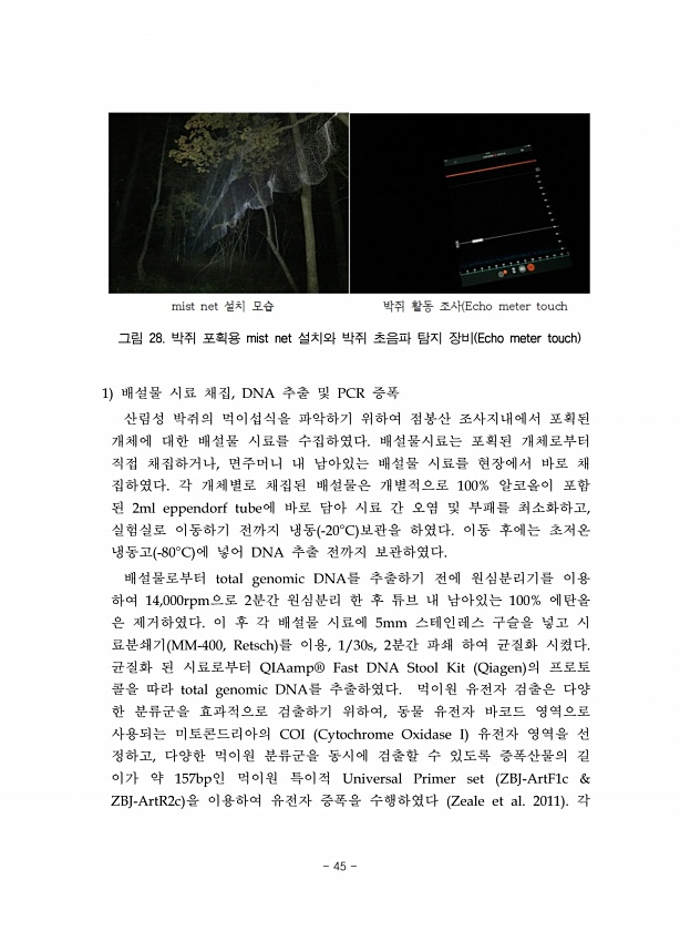 그림 28. 박쥐 포획용 mist net 설치와 박쥐 초음파 탐지 장비 Echo meter touch 1 배설물 시료 채집, DNA 추출 및 PCR 증폭 산림성 박쥐의 먹이섭식을 파악하기 위하여 점봉산 조사지내에서 포획된 개체에 대한 배설물 시료를 수집하였다. 배설물시료는 포획된 개체로부터 직접 채집하거나, 면주머니 내 남아있는 배설물 시료를 현장에서 바로 채 집하였다. 각 개체별로 채집된 배설물은 개별적으로 100% 알코올이 포함 된 2ml eppendorf tube에 바로 담아 시료 간 오염 및 부패를 최소화하고, 실험실로 이동하기 전까지 냉동 -20°C 보관을 하였다. 이동 후에는 초저온 냉동고 -80°C 에 넣어 DNA 추출 전까지 보관하였다. 배설물로부터 total genomic DNA를 추출하기 ...