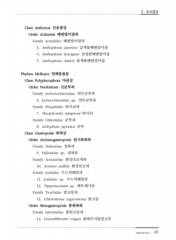 Ⅱ. 조사결과 www.nie.re.kr ? 69 Class Anthozoa 산호충강 Order Actiniaria 해변말미잘목 Family Actiniidae 해변말미잘과 3. Anthopleura japonica 갈색꽃해변말미잘 4. Anthopleura kurogane 검정꽃해변말미잘 5. Anthopleura midori 풀색꽃해변말미잘 Phylum Mollusca 연체동물문 Class Polyplacophora 다판강 Order Neoloricata 신군부목 Family Ischonochitonidae 연두군부과 6. Ischnochitonidae sp. 연두군부류 Family Mopaliidae 따가리과 7. Placiphorella stimpsoni 따가리 Family Chitonidae 군부과 ...