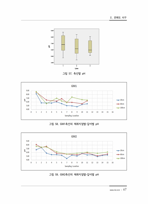 Ⅱ. 관매도 사구 www.nie.re.kr ? 67 그림 57. 측선별 pH 그림 58. GM1측선의 채취지점별-깊이별 pH 그림 59. GM2측선의 채취지점별-깊이별pH