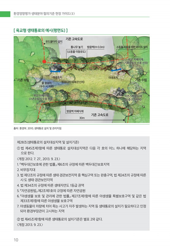 10 환경영향평가 생태분야 협의기준 현장 가이드 Ⅰ [ 육교형 생태통로의 예시 평면도 ] 물 웅덩이 우수 시 저류 위요·차폐식재 기존수림의 수종 선정 위요·차폐식재 기존수림의 수종 선정 자연스러운 식재 다층구조 식재 야생초지 야생초지 징검다리 식재 은신처 기존 고속도로 기존 고속도로 기존 수림 기존 수림 방음벽 차폐식재 30m 통나무 놓기 방음벽 H=3.0m 소동물 이용을 위한 파이프 설치 소동물 이동유도 유도울타리 설치 출처환경부, 2010, 생태통로 설치 및 관리지침 제28조 생태통로의 설치대상지역 및 설치기준 ①?법 제45조제1항에 따른 생태통로 설치대상지역은 다음 각 호의 어느 하나에 해당하는 지역? 으로 한다. 〈개정 2012. 7. 27., 2013. 9. 23.〉 1. 「백두대간보호에 관한 법률...