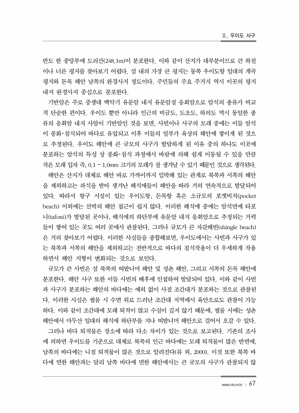 Ⅱ. 우이도 사구 www.nie.re.kr ? 67 반도 한 중앙부에 도리산 248.1m 이 분포한다. 이와 같이 산지가 대부분이므로 큰 하천 이나 너른 평지를 찾아보기 어렵다. 섬 내의 가장 큰 평지는 동쪽 우이도항 일대의 계곡 평지와 돈목 해안 남쪽의 완경사지 정도이다. 주민들의 주요 주거지 역시 이곳의 평지 내지 완경사지 중심으로 분포한다. 기반암은 주로 중생대 백악기 유문암 내지 유문암질 응회암으로 암석의 종류가 비교 적 단순한 편이다. 우이도 뿐만 아니라 인근의 비금도, 도초도, 하의도 역시 동일한 종 류의 응회암 내지 사암이 기반암인 것을 보면, 사빈이나 사구의 모래 중에는 이들 암석 이 풍화?침식되어 바다로 유입되고 이후 이들의 일부가 육상의 해안에 쌓이게 된 것으 로 추정된다. 우이도 해안에 ...
