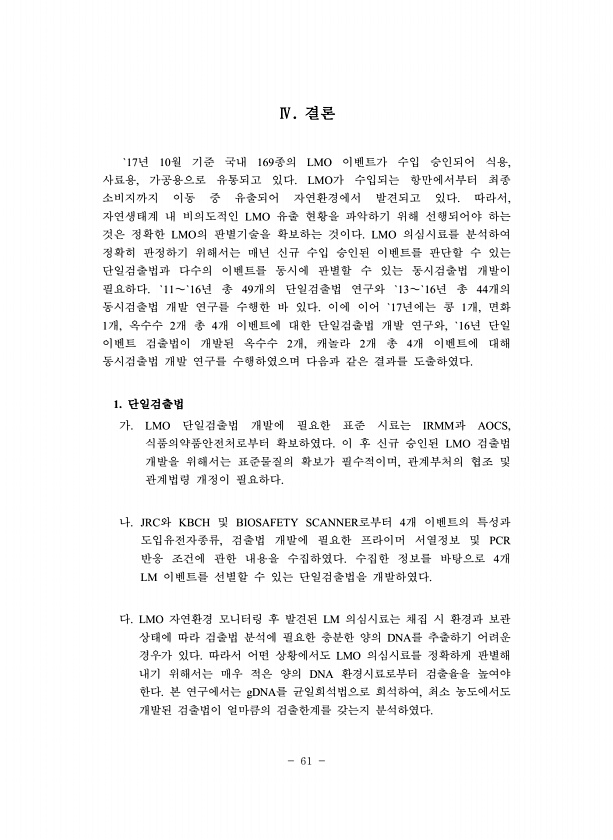61 Ⅳ. 결론 `17년 10월 기준 국내 169종의 LMO 이벤트가 수입 승인되어 식용, 사료용, 가공용으로 유통되고 있다. LMO가 수입되는 항만에서부터 최종 소비지까지 이동 중 유출되어 자연환경에서 발견되고 있다. 따라서, 자연생태계 내 비의도적인 LMO 유출 현황을 파악하기 위해 선행되어야 하는 것은 정확한 LMO의 판별기술을 확보하는 것이다. LMO 의심시료를 분석하여 정확히 판정하기 위해서는 매년 신규 수입 승인된 이벤트를 판단할 수 있는 단일검출법과 다수의 이벤트를 동시에 판별할 수 있는 동시검출법 개발이 필요하다. `11∼`16년 총 49개의 단일검출법 연구와 `13∼`16년 총 44개의 동시검출법 개발 연구를 수행한 바 있다. 이에 이어 `17년에는 콩 1개, 면화 1개, 옥수수 2개 총 4...