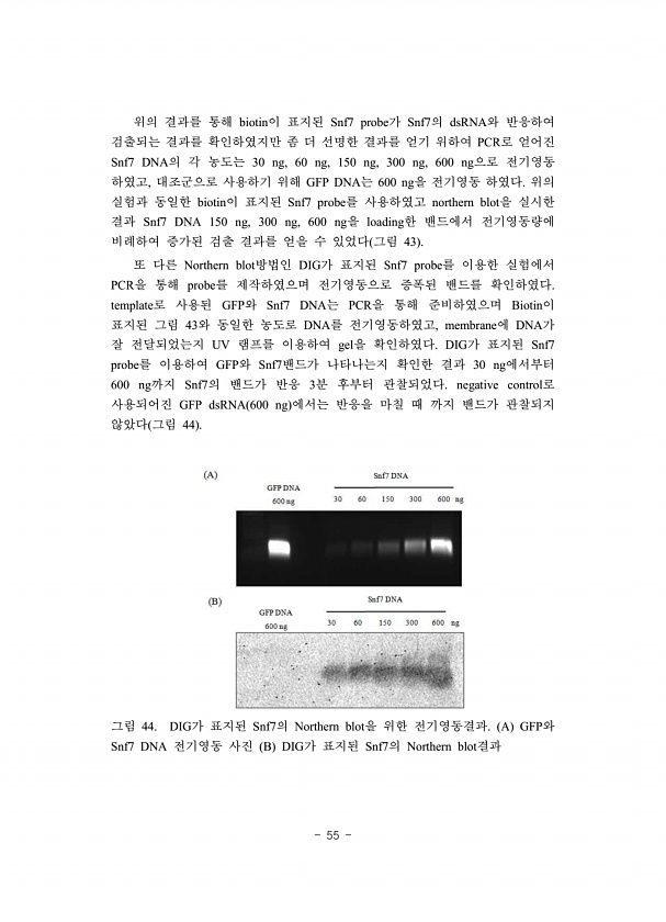 55 위의 결과를 통해 biotin이 표지된 Snf7 probe가 Snf7의 dsRNA와 반응하여 검출되는 결과를 확인하였지만 좀 더 선명한 결과를 얻기 위하여 PCR로 얻어진 Snf7 DNA의 각 농도는 30 ng, 60 ng, 150 ng, 300 ng, 600 ng으로 전기영동 하였고, 대조군으로 사용하기 위해 GFP DNA는 600 ng을 전기영동 하였다. 위의 실험과 동일한 biotin이 표지된 Snf7 probe를 사용하였고 northern blot을 실시한 결과 Snf7 DNA 150 ng, 300 ng, 600 ng을 loading한 밴드에서 전기영동량에 비례하여 증가된 검출 결과를 얻을 수 있었다 그림 43 또 다른 Northern blot방법인 DIG가 표지된 Snf7 probe를 이용한 ...
