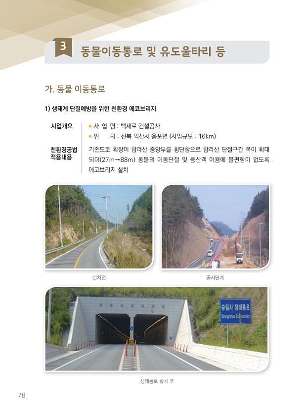 78 3 동물이동통로 및 유도울타리 등 가. 동물 이동통로 설치전 공사단계 생태통로 설치 후 사업개요 ● 사 업 명 백제로 건설공사 ● 위 치 전북 익산시 웅포면 사업규모 16km 기존도로 확장이 함라산 중앙부를 횡단함으로 함라산 단절구간 폭이 확대 되어 27m→88m 동물의 이동단절 및 등산객 이용에 불편함이 없도록 에코브리지 설치 친환경공법 적용내용 1 생태계 단절예방을 위한 친환경에코브리지