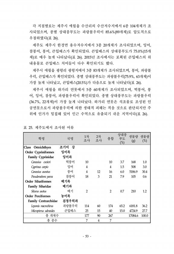 53 각 지점별로는 제주시 애월읍 수산리의 수산저수지에서 6종 104개체가 조 사되었으며, 종별 상대풍부도는 파랑볼우럭이 85.6% 89개체 로 압도적으로 우점하였다 표 26 제주도 제주시 한경면 용수저수지에서 3종 20개체가 조사되었으며, 잉어, 참붕어, 붕어, 큰입배스가 확인되었다. 큰입배스의 상대풍부도가 75.0% 15개 체 로 매우 높게 나타났다 표 26 2015년 조사에서는 포획된 큰입배스의 위 내용물로 큰입배스 치어들이 다수 확인되기도 했다. 제주시 애월읍 광령리 광령지에서 3종 83개체가 조사되었으며, 붕어, 파랑볼 우럭, 큰입배스가 확인되었다. 종별 상대풍부도는 파랑볼우럭 75.9%, 63개체 이 가장 높게 나타났고, 큰입배스 20.5% 가 다음으로 높게 나타났다 표 26 제주시 애월읍 하가리...