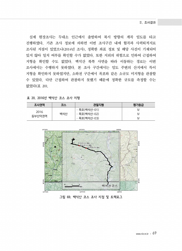 Ⅱ. 조사결과 www.nie.re.kr ? 69 실제 현장조사는 두대소 인근에서 출발하여 북서 방향의 계곡 임도를 타고 진행하였다. 기존 조사 정보에 의하면 이번 조사구간 내에 협곡과 사력퇴적지로 조사된 지점이 있었으나 2014년 조사 , 정확한 좌표 정보 및 해당 사진이 기재되어 있지 않아 일치 여부를 확인할 수가 없었다. 또한 지뢰의 위험으로 인하여 근접하여 지형을 확인할 수도 없었다. 백석산 북쪽 사면을 따라 이동하는 경로는 이번 조사에서는 수행하지 못하였다. 본 조사 구간에서는 임도 주변의 산지에서 특이 지형을 확인하지 못하였지만, 소하천 구간에서 폭포와 같은 소규모 미지형을 관찰할 수 있었다. 다만 근접하여 관찰하지 못했기 때문에 정확한 규모를 측정할 수는 없었다 표 20 조사권역 코스 관찰지형 평...