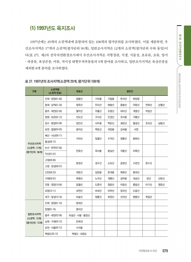 1 1997년도 육지조사 1997년에는 29개의 소권역내에 포함되어 있는 108개의 평가단위를 조사하였다. 이를 세분하면, 우 선조사지역은 17개의 소권역 평가단위 96개 , 일반조사지역은 12개의 소권역 평가단위 수와 동일 이 다 표 27 제2차 전국자연환경조사에서 우선조사지역은 지형경관, 식생, 식물상, 포유류, 조류, 양서 · 파충류, 육상곤충, 어류, 저서성 대형무척추동물의 9개 분야를 조사하고, 일반조사지역은 육상곤충을 제외한 8개 분야를 조사하였다. 표 27. 1997년의 조사지역 소권역 29개, 평가단위 108개 구분 소권역명 소권역 번호 대표산 일반산 우선조사지역 소권역 17개 평가단위 96개 인제 · 양양 01-06 점봉산 가리봉 가칠봉 한석산 북암령 동해 · 삼척 01-30 청옥산 두타산 ...