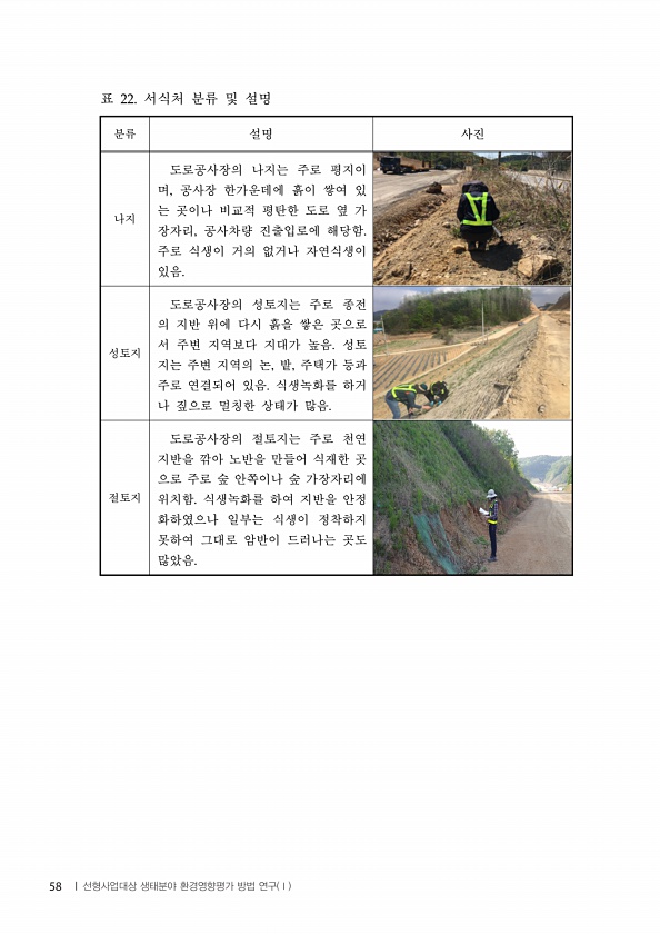 분류 설명 사진 나지 도로공사장의 나지는 주로 평지이 며, 공사장 한가운데에 흙이 쌓여 있 는 곳이나 비교적 평탄한 도로 옆 가 장자리, 공사차량 진출입로에 해당함. 주로 식생이 거의 없거나 자연식생이 있음. 성토지 도로공사장의 성토지는 주로 종전 의 지반 위에 다시 흙을 쌓은 곳으로 서 주변 지역보다 지대가 높음. 성토 지는 주변 지역의 논, 밭, 주택가 등과 주로 연결되어 있음. 식생녹화를 하거 나 짚으로 멀칭한 상태가 많음. 절토지 도로공사장의 절토지는 주로 천연 지반을 깎아 노반을 만들어 식재한 곳 으로 주로 숲 안쪽이나 숲 가장자리에 위치함. 식생녹화를 하여 지반을 안정 화하였으나 일부는 식생이 정착하지 못하여 그대로 암반이 드러나는 곳도 많았음. 표 서식처 분류 및 설명 58 | 선형사업대상 생태...
