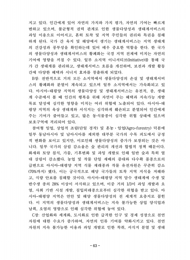 63 지고 있다. 인간에게 있어 자연의 가치와 가치 평가, 자연의 기여는 빠르게 변하고 있으며, 불균형적 권력 관계로 인한 생물다양성과 생태계서비스의 과잉 이용으로 이어지고, 흔히 토착 및 지역 주민들의 권리와 특권을 침해 하게 된다. 국가 간 육지 및 해양에서 생기는 생태계서비스는 지역 생태계 의 건강성과 풍부성을 확인하는데 있어 매우 중요한 역할을 한다. 한 국가 의 생물다양성과 생태계서비스의 황폐화는 국경 지역 전체에 미치는 자연의 기여에 영향을 끼칠 수 있다. 일부 소지역 이니셔티브 Initiative 를 통해 국 가 간 생태계를 관리하고, 생태계서비스 흐름을 개선하며, 보전과 개발 활동 간에 다양한 혜택과 시너지 효과를 창출하게 되었다. B장전반적으로 거의 모든 소지역에서 생물다양성의 손실 및 생태...