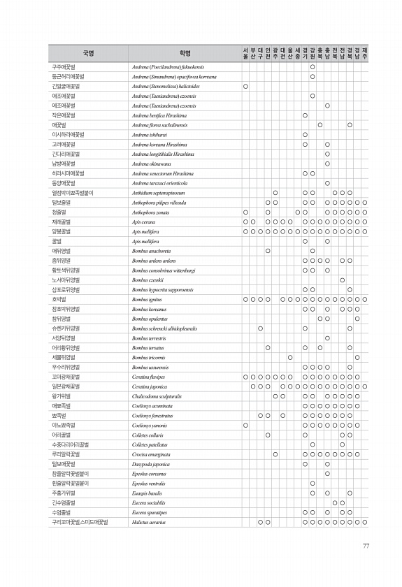 77 구주애꽃벌 Andrena Poecilandrena fukuokensis ○ 둥근허리애꽃벌 Andrena Simandrena opacifovea korreana ○ 긴얼굴애꽃벌 Andrena Stenomelissa halictoides ○ 애조애꽃벌 Andrena Taeniandrena ezoensis ○ 에조애꽃벌 Andrena Taeniandrena ezoensis ○ 작은애꽃벌 Andrena benifca Hirashima ○ 애꽃벌 Andrena forea sachalinensis ○ ○ 이시하라애꽃벌 Andrena ishiharai ○ 고려애꽃벌 Andrena koreana Hirashima ○ ○ 긴다리애꽃벌 Andrena longitibialis Hirashima ○ 남방애꽃벌 Andrena...