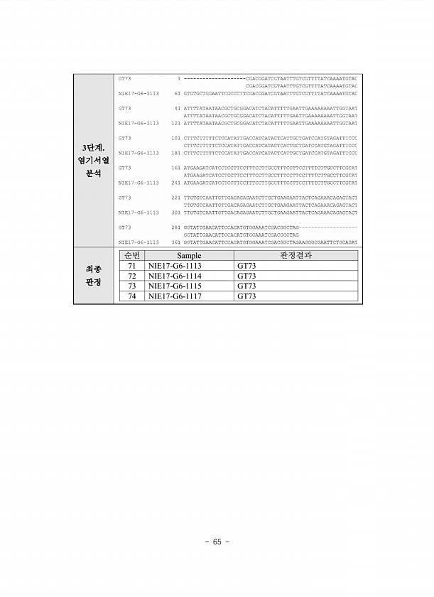 65 3단계. 염기서열 분석 최종 판정 순번 Sample 판정결과 71 NIE17-G6-1113 GT73 72 NIE17-G6-1114 GT73 73 NIE17-G6-1115 GT73 74 NIE17-G6-1117GT73