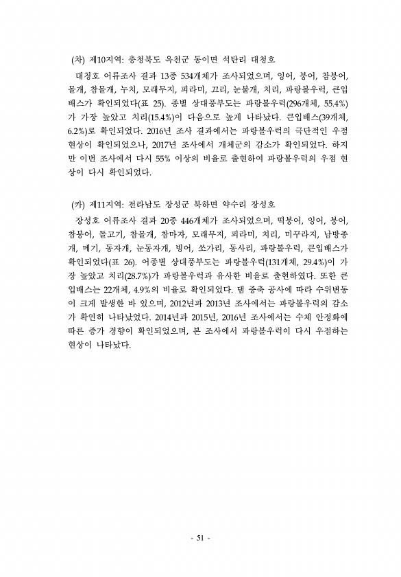 51 차 제10지역충청북도 옥천군 동이면 석탄리 대청호 대청호 어류조사 결과 13종 534개체가 조사되었으며, 잉어, 붕어, 참붕어, 몰개, 참몰개, 누치, 모래무지, 피라미, 끄리, 눈불개, 치리, 파랑볼우럭, 큰입 배스가 확인되었다 표 25 종별 상대풍부도는 파랑볼우럭 296개체, 55.4% 가 가장 높았고 치리 15.4% 이 다음으로 높게 나타났다. 큰입배스 39개체, 6.2% 로 확인되었다. 2016년 조사 결과에서는 파랑볼우럭의 극단적인 우점 현상이 확인되었으나, 2017년 조사에서 개체군의 감소가 확인되었다. 하지 만 이번 조사에서 다시 55% 이상의 비율로 출현하여 파랑볼우럭의 우점 현 상이 다시 확인되었다. 카 제11지역전라남도 장성군 북하면 약수리 장성호 장성호 어류조사 결과 20종 446개...