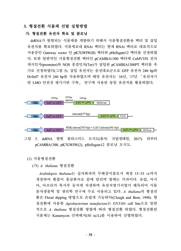 58 3. 형질전환 식물체 선발 실험방법 가. 형질전환 유전자 확보 및 클로닝 dsRNA가 발현되는 식물체를 개발하기 위해서 식물형질전환용 벡터 및 삽입 유전자를 확보하였다. 식물세포내 RNAi 벡터는 현재 RNAi 벡터로 대표적으로 사용중인 Gateway vector 인 pK7GWIW II 벡터와 pHellsgate12 벡터를 선정하였 다. 또한 일반적인 식물형질전환 벡터인 pCAMBIA1300 벡터에 CaMV35S 전사 개시인자 promoter 와 NOS 종결인자 Ter 가 삽입된 pCAMBIA1300PT 벡터를 추 가로 선정하였다 그림 5 삽입 유전자는 음성대조군으로 GFP 유전자 240 bp와 DvSnf7 유전자 240 bp를 사용하였으며 해당 유전자는 `16년, `17년 「유전자기 반 LMO 안전성...