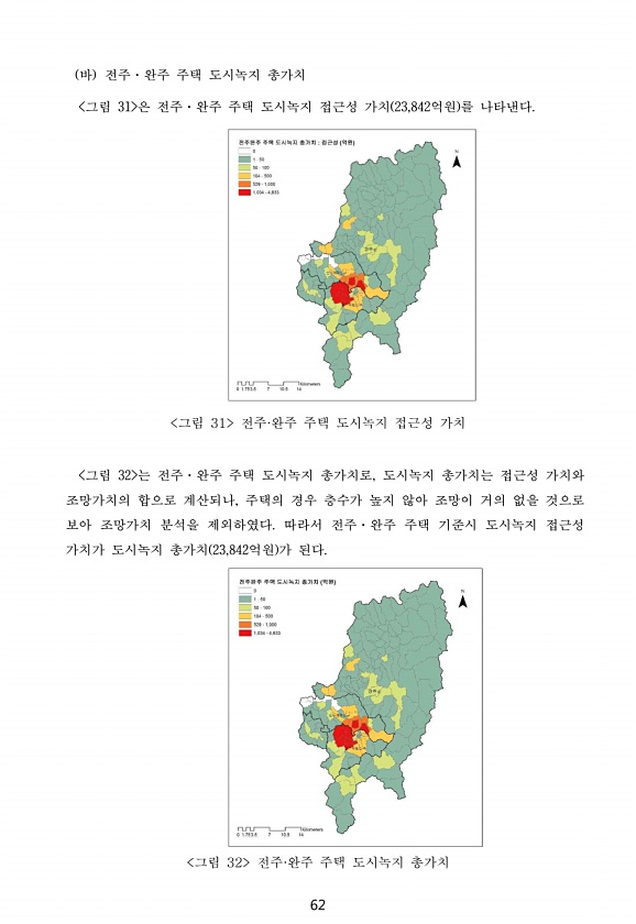 62 바 전주·완주 주택 도시녹지 총가치 그림 31 은 전주·완주 주택 도시녹지 접근성 가치 23,842억원 를 나타낸다. 그림 31 전주·완주 주택 도시녹지 접근성 가치 그림 32 는 전주·완주 주택 도시녹지 총가치로, 도시녹지 총가치는 접근성 가치와 조망가치의 합으로 계산되나, 주택의 경우 층수가 높지 않아 조망이 거의 없을 것으로 보아 조망가치 분석을 제외하였다. 따라서 전주·완주 주택 기준시 도시녹지 접근성 가치가 도시녹지 총가치 23,842억원 가 된다. 그림 32 전주·완주 주택 도시녹지총가치