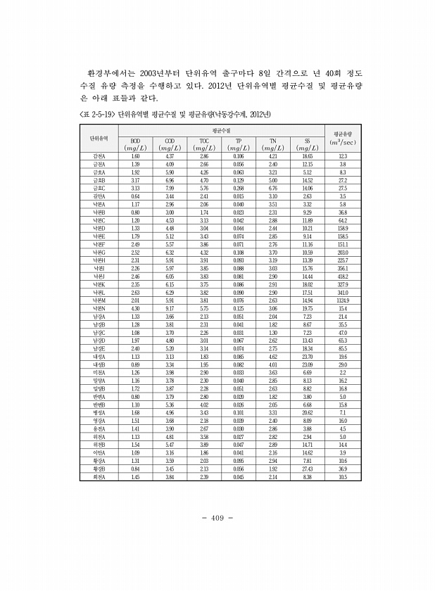 409 환경부에서는 2003년부터 단위유역 출구마다 8일 간격으로 년 40회 정도 수질 유량 측정을 수행하고 있다. 2012년 단위유역별 평균수질 및 평균유량 은 아래 표들과 같다. 단위유역 평균수질 평균유량 BOD ?sec ?? COD ?? TOC ?? TP ?? TN ?? SS ?? 감천A 1.60 4.37 2.86 0.106 4.21 18.65 12.3 금천A 1.39 4.09 2.66 0.056 2.40 12.15 3.8 금호A 1.92 5.90 4.26 0.063 3.21 5.12 8.3 금호B 3.17 6.96 4.70 0.129 5.00 14.52 27.2 금호C 3.13 7.99 5.76 0.268 6.76 14.06 27.5 길안A 0.64 3....
