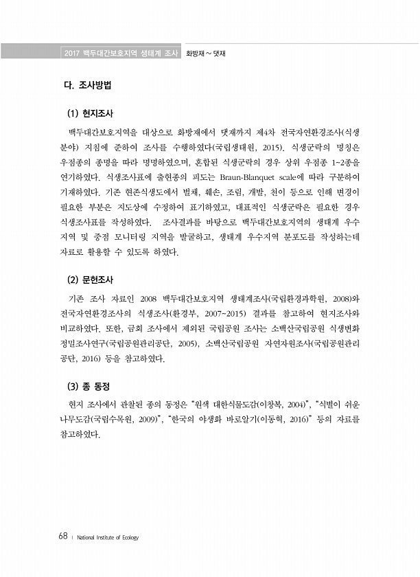 2017 백두대간보호지역 생태계 조사 화방재 댓재 68 ? National Institute of Ecology 다. 조사방법 1 현지조사 백두대간보호지역을 대상으로 화방재에서 댓재까지 제4차 전국자연환경조사 식생 분야 지침에 준하여 조사를 수행하였다 국립생태원, 2015 식생군락의 명칭은 우점종의 종명을 따라 명명하였으며, 혼합된 식생군락의 경우 상위 우점종 12종을 연기하였다. 식생조사표에 출현종의 피도는 Braun-Blanquet scale에 따라 구분하여 기재하였다. 기존 현존식생도에서 벌채, 훼손, 조림, 개발, 천이 등으로 인해 변경이 필요한 부분은 지도상에 수정하여 표기하였고, 대표적인 식생군락은 필요한 경우 식생조사표를 작성하였다. 조사결과를 바탕으로 백두대간보호지역의 생태계 우수 지역 및 중...