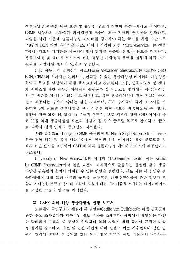 69 생물다양성 관측을 위한 표준 및 유연한 구조의 개발이 우선과제라고 적시하며, CBMP 업무와의 보완성과 의사결정에 도움이 되는 지표의 중요성을 강조하고, 다양한 사례 가운데 생물다양성 데이터를 평가해야 하는 국가를 위한 수단으로 “9단계 BON 개발 과정”을 강조. 데이터 시각화 기법‘NatureService’는 생물 다양성 지표의 계기판을 제공하여 정책 결과를 창출할 수 있는 용도를 강화하며, 생물다양성 및 생태계 서비스에 관한 정부간 과학정책 플랫폼 업무에 북극 조사 결과를 포함시킬 필요가 있다고 주장했다. CBD 사무국의 알렉산더 셰스타코프 Alexander Shestakov 는 CBD와 GEO BON, CBMP의 시너지를 논의하며, 신뢰할 수 있는 생물다양성 데이터의 가용성은 협약의 목표를 달성...