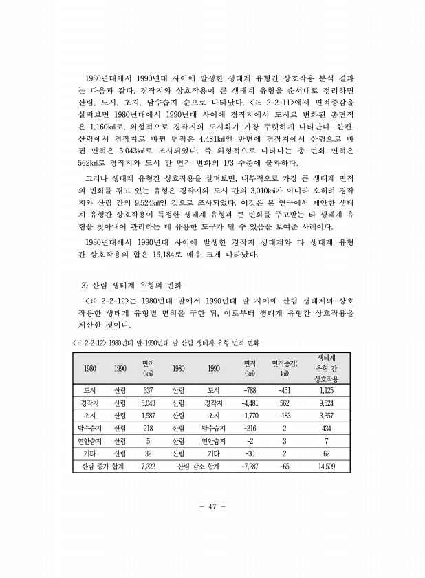 47 1980년대에서 1990년대 사이에 발생한 생태계 유형간 상호작용 분석 결과 는 다음과 같다. 경작지와 상호작용이 큰 생태계 유형을 순서대로 정리하면 산림, 도시, 초지, 담수습지 순으로 나타났다. 표 2-2-11 에서 면적증감을 살펴보면 1980년대에서 1990년대 사이에 경작지에서 도시로 변화된 총면적 은 1,160㎢로, 외형적으로 경작지의 도시화가 가장 뚜렷하게 나타난다. 한편, 산림에서 경작지로 바뀐 면적은 4,481㎢인 반면에 경작지에서 산림으로 바 뀐 면적은 5,043㎢로 조사되었다. 즉 외형적으로 나타나는 총 변화 면적은 562㎢로 경작지와 도시 간 면적 변화의 1/3 수준에 불과하다. 그러나 생태계 유형간 상호작용을 살펴보면, 내부적으로 가장 큰 생태계 면적 의 변화를 겪고 있는 유형은 ...