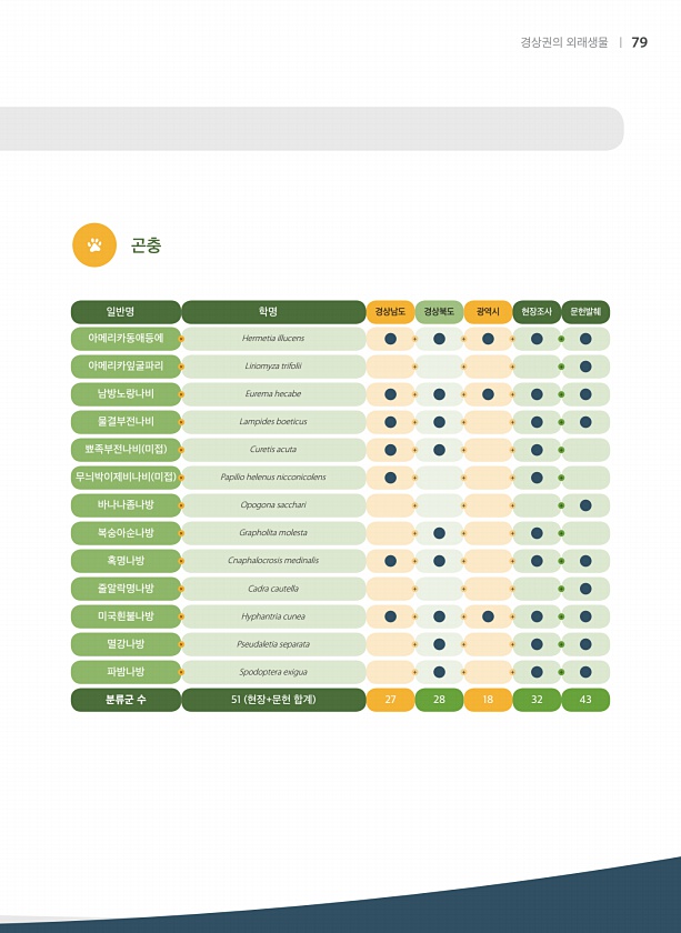 곤충 아메리카동애등에 Hermetia illucens 아메리카잎굴파리 Liriomyza trifolii 남방노랑나비 Eurema hecabe 물결부전나비 Lampides boeticus 뾰족부전나비 미접 Curetis acuta 무늬박이제비나비 미접 Papilio helenus nicconicolens 바나나좀나방 Opogona sacchari 복숭아순나방 Grapholita molesta 혹명나방 Cnaphalocrosis medinalis 줄알락명나방 Cadra cautella 미국흰불나방 Hyphantria cunea 멸강나방 Pseudaletia separata 파밤나방 Spodoptera exigua 분류군 수 51 현장+문헌 합계 27 28 18 32 43 일반명 학명 경상남도 경상북도 광역시 현...