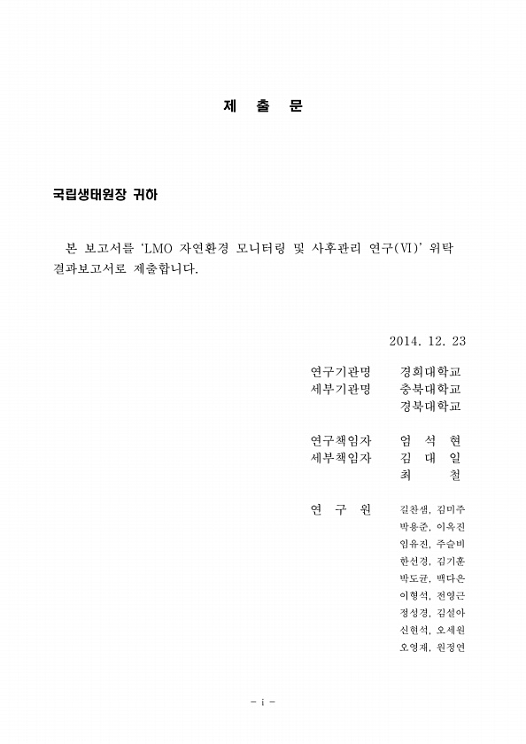 i 제 출 문 국립생태원장 귀하 본 보고서를 ‘LMO 자연환경 모니터링 및 사후관리 연구 Ⅵ ’ 위탁 결과보고서로 제출합니다. 2014. 12. 23 연구기관명 경희대학교 세부기관명 충북대학교 경북대학교 연구책임자 엄 석 현 세부책임자 김 대 일 최 철 연 구 원 길찬샘, 김미주 박용준, 이옥진 임유진, 주슬비 한선경, 김기훈 박도균, 백다은 이형석, 전영근 정성경, 김설아 신현석, 오세원 오영재,원정연