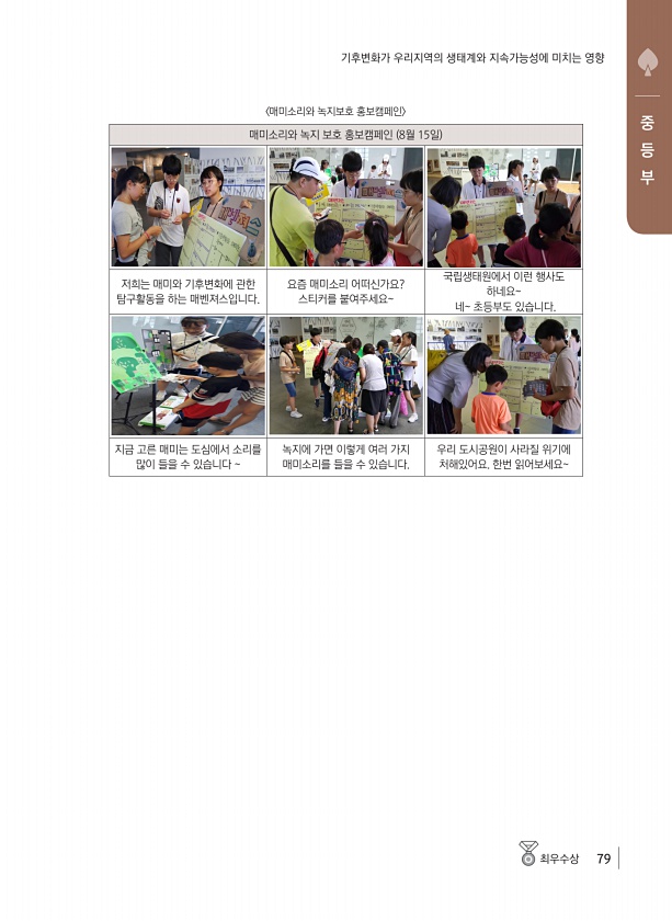최우수상 79 중 등 부 기후변화가 우리지역의 생태계와 지속가능성에 미치는 영향 매미소리와 녹지보호 홍보캠페인 매미소리와 녹지 보호 홍보캠페인 8월 15일 저희는 매미와 기후변화에 관한 탐구활동을 하는 매벤져스입니다. 요즘 매미소리 어떠신가요? 스티커를 붙여주세요국립생태원에서 이런 행사도 하네요네초등부도 있습니다. 지금 고른 매미는 도심에서 소리를 많이 들을 수 있습니다 녹지에 가면 이렇게 여러 가지 매미소리를 들을 수 있습니다. 우리 도시공원이 사라질 위기에 처해있어요. 한번읽어보세요