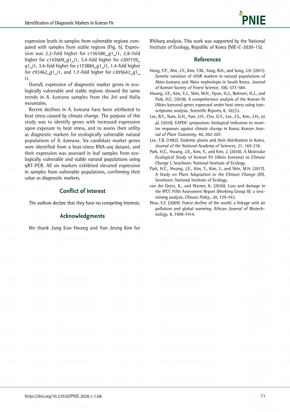 Identification of Diagnostic Markers in Korean Fir https//doi.org/10.22920/PNIE.2020.1.1.68 73 expression levels in samples from vulnerable regions compared with samples from stable regions Fig. 5 Expression was 2.2-fold higher for c156586_g1_i1, 2.8-fold higher for c142609_g1_i1, 3.4-fold higher for c207159_ g1_i1, 3.4-fold higher for c173884_g1_i1, 1.4-fold higher for c93462_g1_i1, and 1.7-fold ...