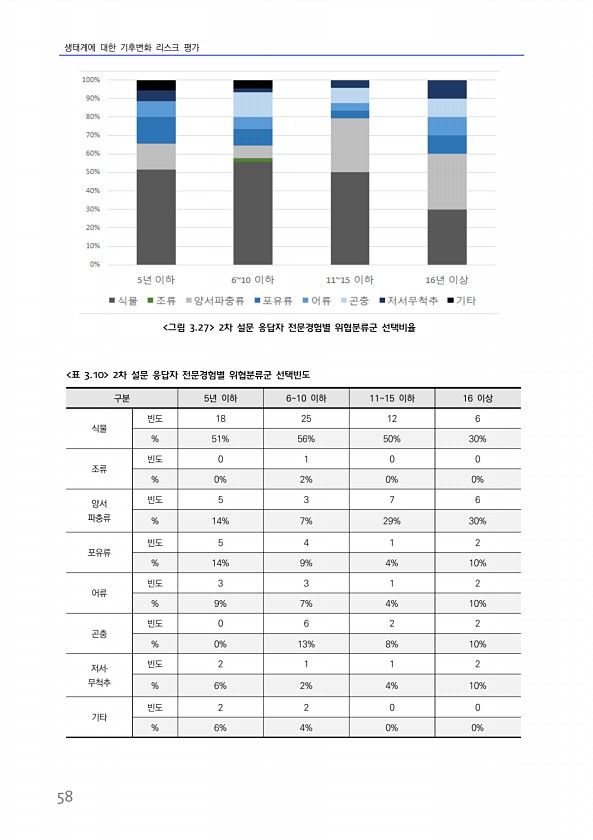 생태계에 대한 기후변화 리스크 평가 58 구분 5년 이하 610 이하 1115 이하 16 이상 식물 빈도 18 25 12 6 % 51% 56% 50% 30% 조류 빈도 0 1 0 0 % 0% 2% 0% 0% 양서 파충류 빈도 5 3 7 6 % 14% 7% 29% 30% 포유류 빈도 5 4 1 2 % 14% 9% 4% 10% 어류 빈도 3 3 1 2 % 9% 7% 4% 10% 곤충 빈도 0 6 2 2 % 0% 13% 8% 10% 저서? 무척추 빈도 2 1 1 2 % 6% 2% 4% 10% 기타 빈도 2 2 0 0 % 6% 4% 0% 0% 표 3.10 2차 설문 응답자 전문경험별 위협분류군 선택빈도 그림 3.27 2차 설문 응답자 전문경험별 위협분류군선택비율