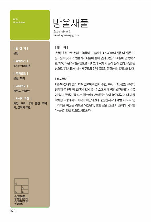 078 ① ② ③ ④ ① 방울새풀 ② 생육지 공터 ③ 생육지 공터 ④ 분포도 | 생 태 | 1년생 초본으로 전체가 녹색이고 높이가 30∼40cm에 달한다. 잎은 드 문드문 어긋나고, 원줄기와 더불어 털이 없다. 꽃은 5∼6월에 연녹색으 로 피며, 작은 이삭은 밑으로 처지고 3∼6개의 꽃이 들어 있다. 유럽 원 산으로 우리나라에서는 제주도와 전남 목포의 유달산에서 자라고 있다. | 분포현황 | 제주도 전체에 널리 퍼져 있으며 해안가 주변, 도로, 나지, 공원, 주택가, 경작지 등 인위적 교란이 일어나는 장소에서 대부분 발견되었다. 수목 이 없고 햇볕이 잘 드는 장소에서 서식하는 것이 확인되었고, 나지 등 척박한 토양에서도 서식이 확인되었다. 중산간지역의 개발 시 도로 및 나대지로 확산될 것으로 예상된다. 또한...