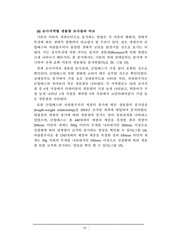 54 4 조사지역별 생물량 조사결과 비교 기존의 어류의 개체수만으로 분석하는 방법은 각 어종의 형태적, 생태적 특성에 따른 생태적 영향력이 과소평가 될 우려가 있다. 같은 개체수의 큰 입배스와 파랑볼우럭이 동일한 생태적 교란을 발생시킬 것으로 보기는 어 렵다. 이는 섭식특성에 의한 차이도 있지만 생물량 Biomass 에 의한 영향도 크게 나타나기 때문이다. 본 분석에서는 기존의 개체 상대풍부도 분석에 추 가하여 전체 포획 어종의 생물량을 분석하였다 표 29, 그림 13 전체 조사지역의 생물량 분석결과, 큰입배스가 가장 많이 포획된 것으로 확인되어, 큰입배스의 의한 생태계 교란이 매우 심각한 것으로 확인되었다. 상대풍부도 분석에서 가장 높은 상대풍부도를 나타낸 치리, 파랑볼우럭은 큰입배스와 잉어보다 적은 생물...