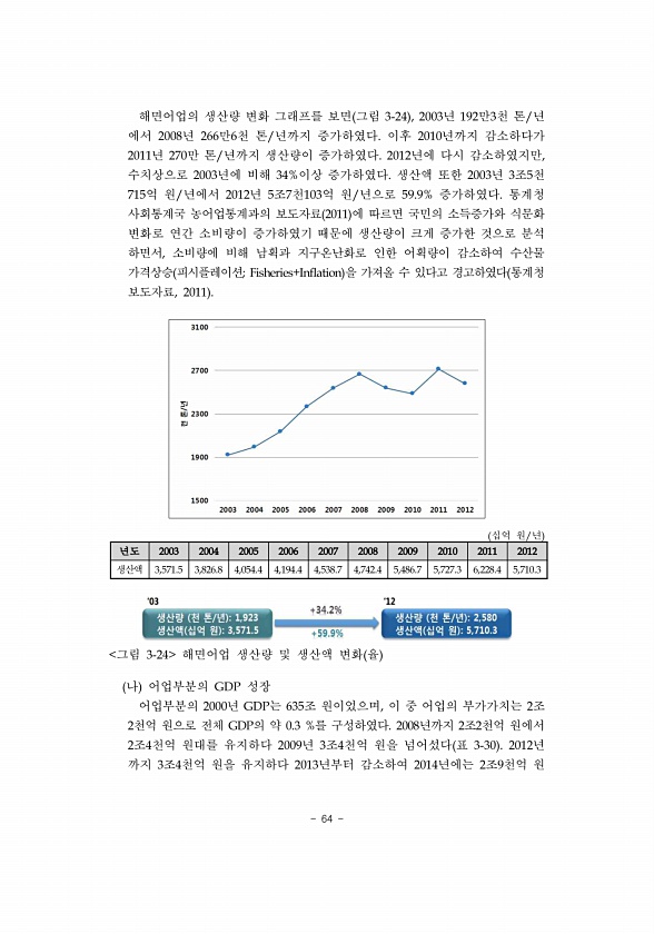 64 년도 2003 2004 2005 2006 2007 2008 2009 2010 2011 2012 생산액 3,571.5 3,826.8 4,054.4 4,194.4 4,538.7 4,742.4 5,486.7 5,727.3 6,228.4 5,710.3 해면어업의 생산량 변화 그래프를 보면 그림 3-24 , 2003년 192만3천 톤/년 에서 2008년 266만6천 톤/년까지 증가하였다. 이후 2010년까지 감소하다가 2011년 270만 톤/년까지 생산량이 증가하였다. 2012년에 다시 감소하였지만, 수치상으로 2003년에 비해 34%이상 증가하였다. 생산액 또한 2003년 3조5천 715억 원/년에서 2012년 5조7천103억 원/년으로 59.9% 증가하였다. 통계청 사회통계국 농어업통계과의 보도자료 2011...
