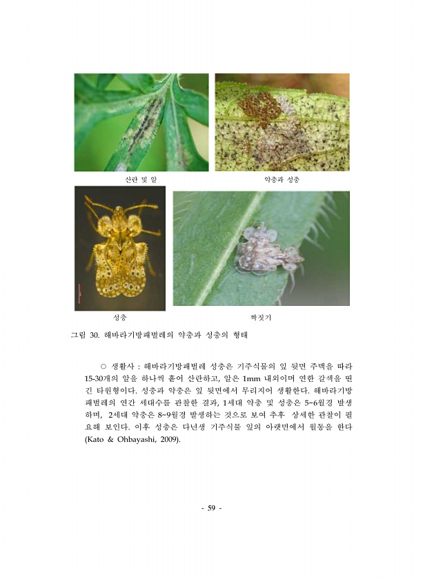 59 산란 및 알 약충과 성충 성충 짝짓기 그림 30. 해바라기방패벌레의 약충과 성충의 형태 ○ 생활사 해바라기방패벌레 성충은 기주식물의 잎 뒷면 주맥을 따라 15-30개의 알을 하나씩 흩어 산란하고, 알은 1mm 내외이며 연한 갈색을 띤 긴 타원형이다. 성충과 약충은 잎 뒷면에서 무리지어 생활한다. 해바라기방 패벌레의 연간 세대수를 관찰한 결과, 1세대 약충 및 성충은 56월경 발생 하며, 2세대 약충은 89월경 발생하는 것으로 보여 추후 상세한 관찰이 필 요해 보인다. 이후 성충은 다년생 기주식물 잎의 아랫면에서 월동을 한다 Kato & Ohbayashi, 2009
