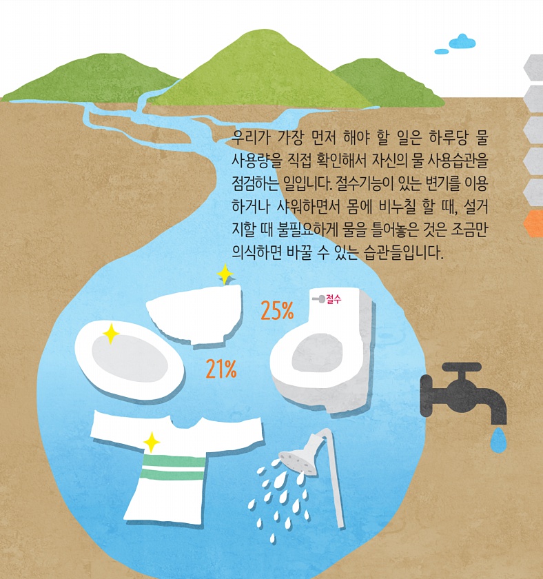 77 ● 21% 25% 절수 우리가 가장 먼저 해야 할 일은 하루당 물 사용량을 직접 확인해서 자신의 물 사용습관을 점검하는 일입니다. 절수기능이 있는 변기를 이용 하거나 샤워하면서 몸에 비누칠 할 때, 설거 지할 때 불필요하게 물을 틀어놓은 것은 조금만 의식하면 바꿀 수 있는습관들입니다.