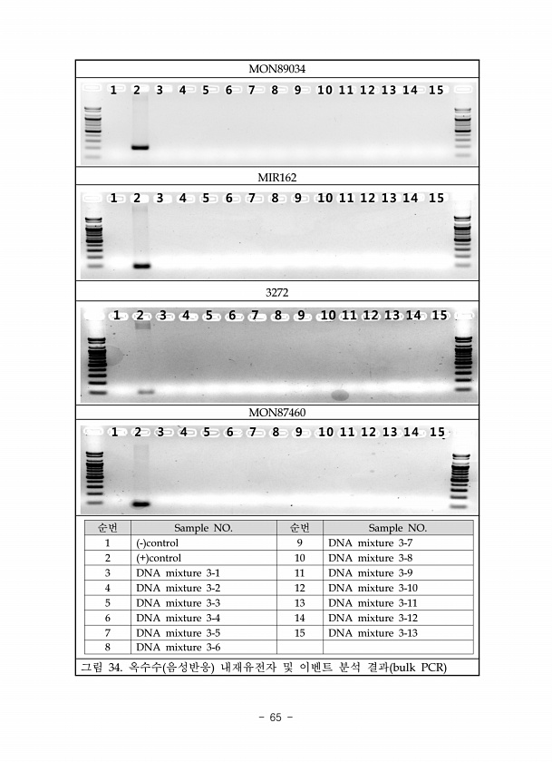MON89034 MIR162 3272 MON87460 순번 Sample NO. 순번 Sample NO. 1 control 9 DNA mixture 3-7 2 + control 10 DNA mixture 3-8 3 DNA mixture 3-1 11 DNA mixture 3-9 4 DNA mixture 3-2 12 DNA mixture 3-10 5 DNA mixture 3-3 13 DNA mixture 3-11 6 DNA mixture 3-4 14 DNA mixture 3-12 7 DNA mixture 3-5 15 DNA mixture 3-13 8 DNA mixture 3-6 그림 34. 옥수수 음성반응 내재유전자 및 이벤트 분석 결과 bulk PCR