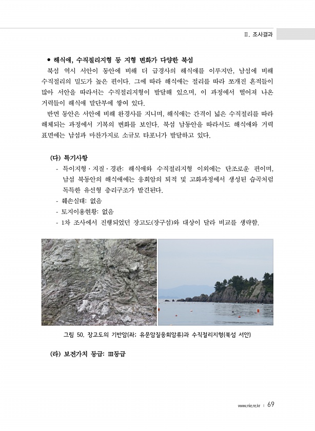 Ⅱ. 조사결과 www.nie.re.kr ? 69 ? 해식애, 수직절리지형 등 지형 변화가 다양한 북섬 북섬 역시 서안이 동안에 비해 더 급경사의 해식애를 이루지만, 남섬에 비해 수직절리의 밀도가 높은 편이다. 그에 따라 해식애는 절리를 따라 쪼개진 흔적들이 많아 서안을 따라서는 수직절리지형이 발달해 있으며, 이 과정에서 떨어져 나온 거력들이 해식애 말단부에 쌓여 있다. 반면 동안은 서안에 비해 완경사를 지니며, 해식애는 간격이 넓은 수직절리를 따라 해체되는 과정에서 기복의 변화를 보인다. 북섬 남동안을 따라서도 해식애와 거력 표면에는 남섬과 마찬가지로 소규모 타포니가 발달하고 있다. 다 특기사항 특이지형·지질·경관해식애와 수직절리지형 이외에는 단조로운 편이며, 남섬 북동안의 해식애에는 응회암의 퇴적 및 고화...