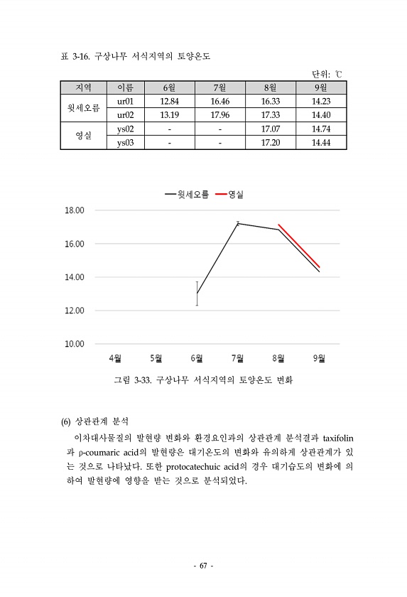 67 단위℃ 지역 이름 6월 7월 8월 9월 윗세오름 ur01 12.84 16.46 16.33 14.23 ur02 13.19 17.96 17.33 14.40 영실 ys02 17.07 14.74 ys03 17.20 14.44 표 3-16. 구상나무 서식지역의 토양온도 그림 3-33. 구상나무 서식지역의 토양온도 변화 6 상관관계 분석 이차대사물질의 발현량 변화와 환경요인과의 상관관계 분석결과 taxifolin 과 ρ-coumaric acid의 발현량은 대기온도의 변화와 유의하게 상관관계가 있 는 것으로 나타났다. 또한 protocatechuic acid의 경우 대기습도의 변화에 의 하여 발현량에 영향을 받는 것으로분석되었다.