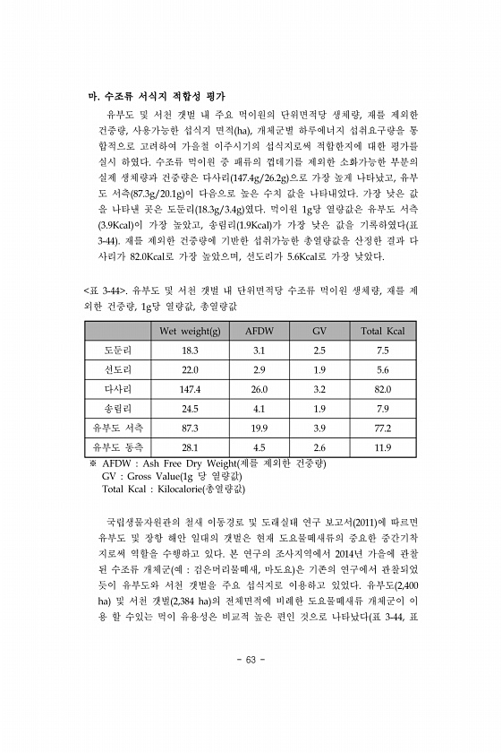 63 마. 수조류 서식지 적합성 평가 유부도 및 서천 갯벌 내 주요 먹이원의 단위면적당 생체량, 재를 제외한 건중량, 사용가능한 섭식지 면적 ha , 개체군별 하루에너지 섭취요구량을 통 합적으로 고려하여 가을철 이주시기의 섭식지로써 적합한지에 대한 평가를 실시 하였다. 수조류 먹이원 중 패류의 껍데기를 제외한 소화가능한 부분의 실제 생체량과 건중량은 다사리 147.4g/26.2g 으로 가장 높게 나타났고, 유부 도 서측 87.3g/20.1g 이 다음으로 높은 수치 값을 나타내었다. 가장 낮은 값 을 나타낸 곳은 도둔리 18.3g/3.4g 였다. 먹이원 1g당 열량값은 유부도 서측 3.9Kcal 이 가장 높았고, 송림리 1.9Kcal 가 가장 낮은 값을 기록하였다 표 3-44 재를 제외한 건중량에 기반한 섭취...